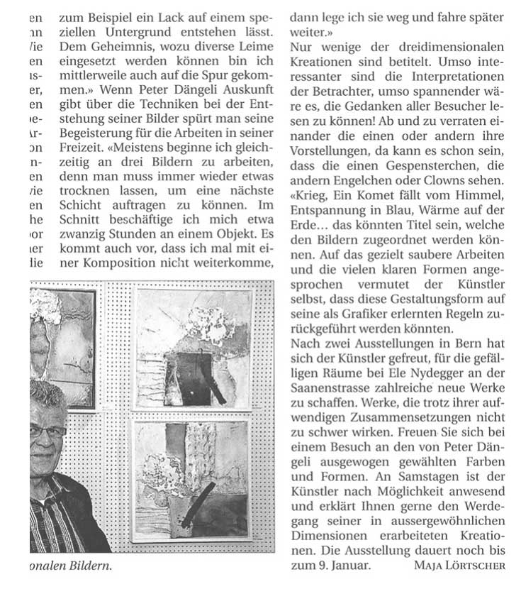 Nach zwei Ausstellungen in Bern hat sicher der Künstler gefreut, für die gefälligen Räume bei Ele Nydegger an der Saanenstrasse zahlreiche neue Werke zu schaffen. Werke, die trotz ihrer aufwendigen Zusammensetzungen nicht zu schwer wirken. Freuen Sie sich bei einem Besuch an den von Peter Dängeli ausgewogen gewählten Farben und Formen. An Samstagen ist der Künstler nach Möglichkeit anwesend und erklärt Ihnen gerne den Werdegang seiner in aussergewöhnlichen Dimensionen erarbeiteten Kreationen. Die Ausstellung dauert noch bis zum 9. Januar.